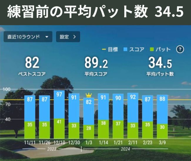 このアマチュアプレーヤーは、パーフェクトストロークで練習する前のラウンド 平均パット数は34.5でした。